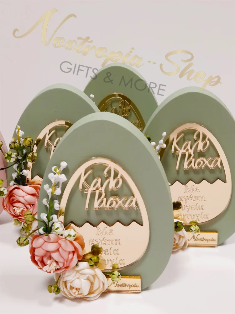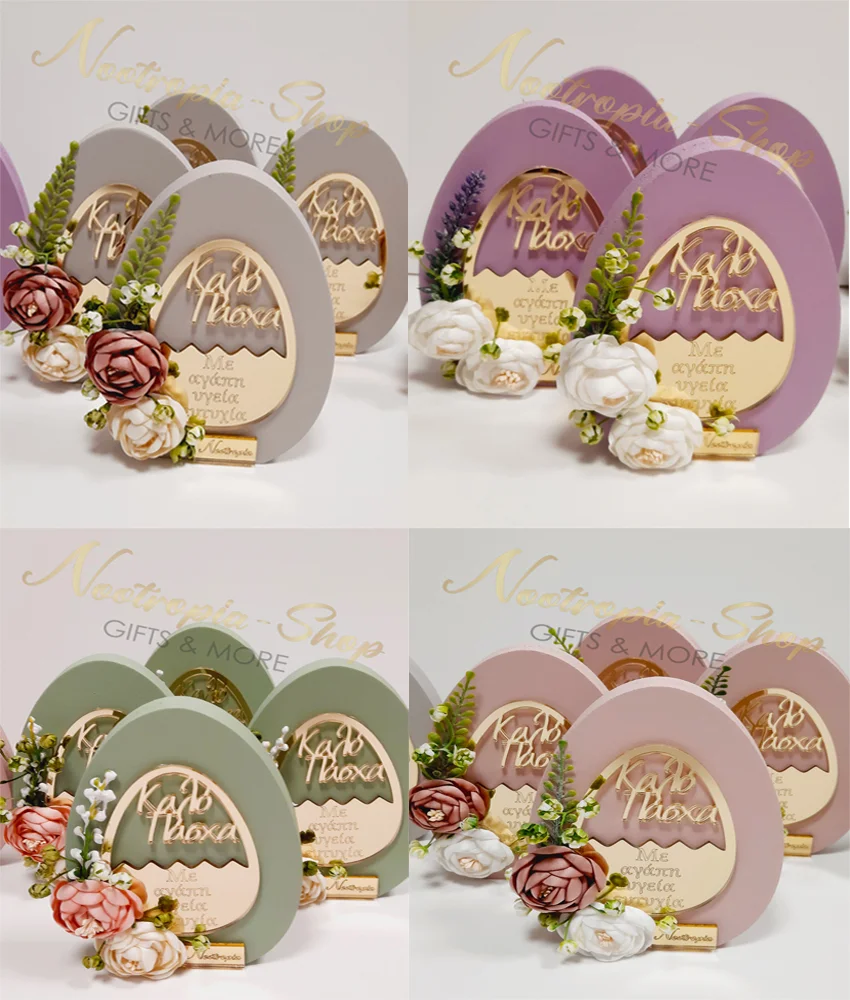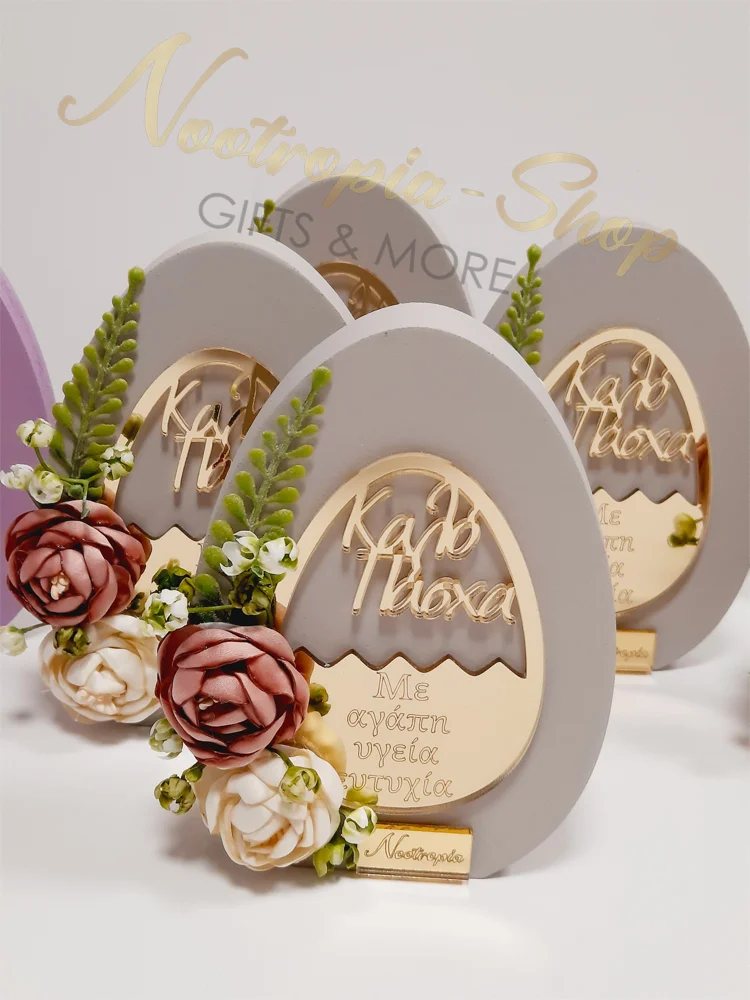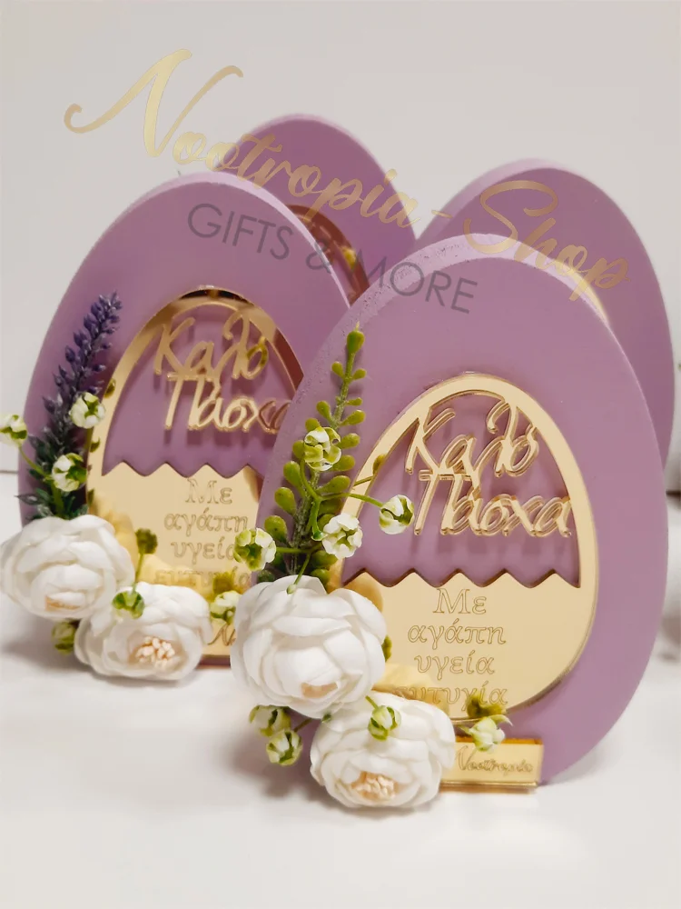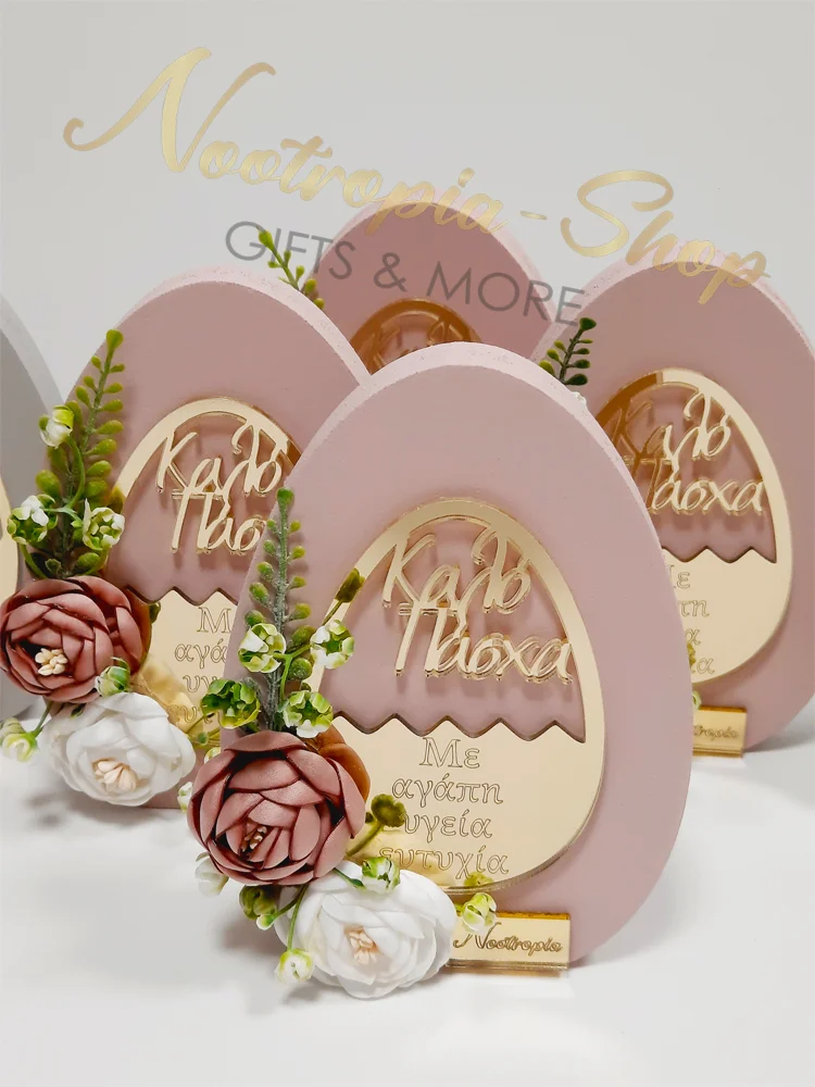 Χειροποίητο πασχαλινό δώρο ξύλινο αυγό 15 εκ. με περίτεχνο σκαλισμένο σε πλεξιγκλάς ΚΑΛΟ ΠΑΣΧΑ και ευχές με ΑΓΑΠΗ, ΥΓΕΙΑ, ΕΥΤΥΧΙΑ. Είναι διακοσμημένο με ιδιαίτερα λουλούδια σε ροζ και λευκό καθιστώντας το ιδανικό δώρο για φίλους, οικογένεια και συνεργάτες.