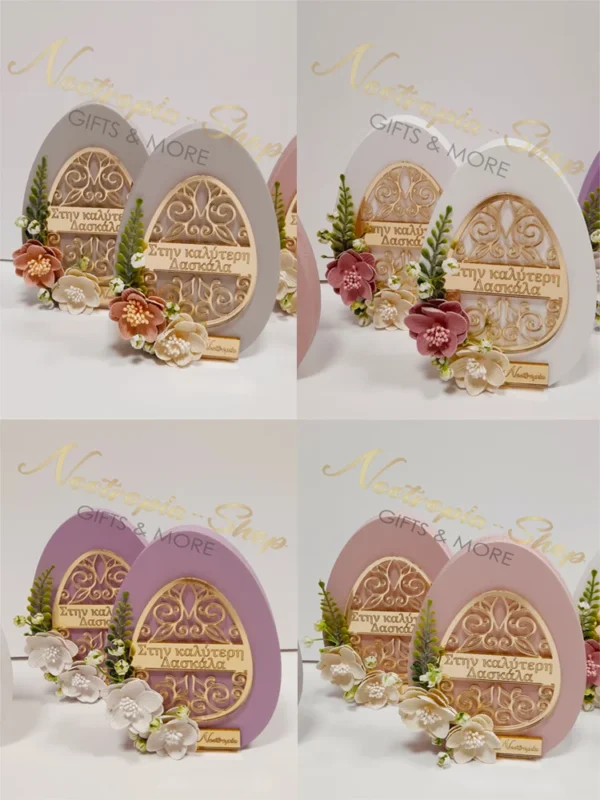 Χειροποίητο πασχαλινό δώρο ξύλινο αυγό 15 εκ. με περίτεχνο σχέδιο απο πλεξιγκλάς διακοσμημένο με ιδιαίτερα λουλούδια ροζ και λευκά με πράσινες λεπτομέρειες και ανάγλυφη χάραξη ΣΤΗΝ ΚΑΛΥΤΕΡΗ ΔΑΣΚΆΛΑ.