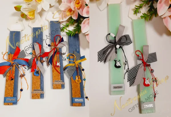Εφηβική ρουστίκ χειροποίητη λαμπάδα με πλεξιγκλάς βιολί ή κιθάρα, κορδόνια, χάντρες, κορδέλα φελού & ιδιαίτερο δέσιμο.