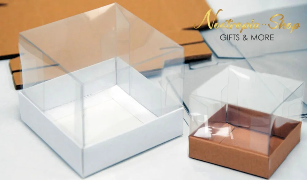 Χάρτινο κουτί με καπάκι ζελατίνη 9χ9χ7 εκ. σε δύο χρώματα Λευκό και Φυσικό.