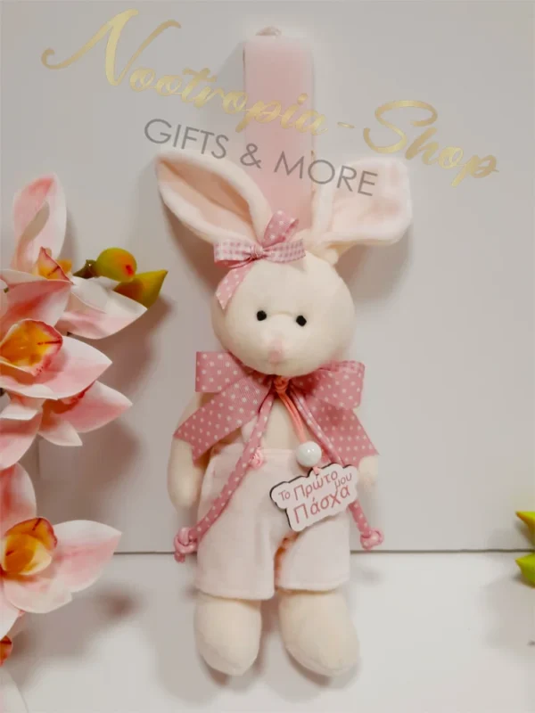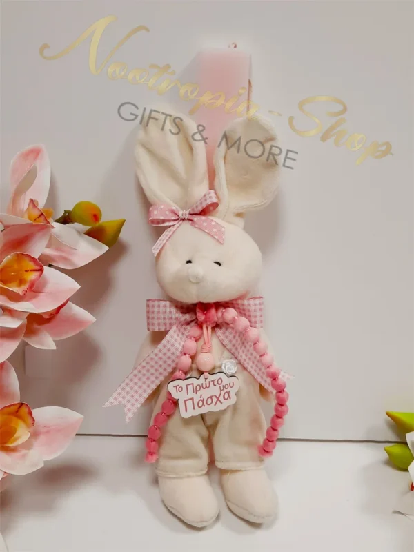 Χειροποίητη αρωματική ρουστίκ λαμπάδα ΠΡΩΤΟ ΜΟΥ ΠΑΣΧΑ. Είναι διακοσμημένη με απαλό λούτρινο λαγουδάκι σε Ροζ ή Εκρού απόχρωση και ξύλινη επιγραφή το ΠΡΩΤΟ ΜΟΥ ΠΑΣΧΑ, ρομαντικές λεπτομέρειες με καρό κορδέλες και ροζ πον πον.