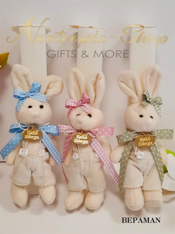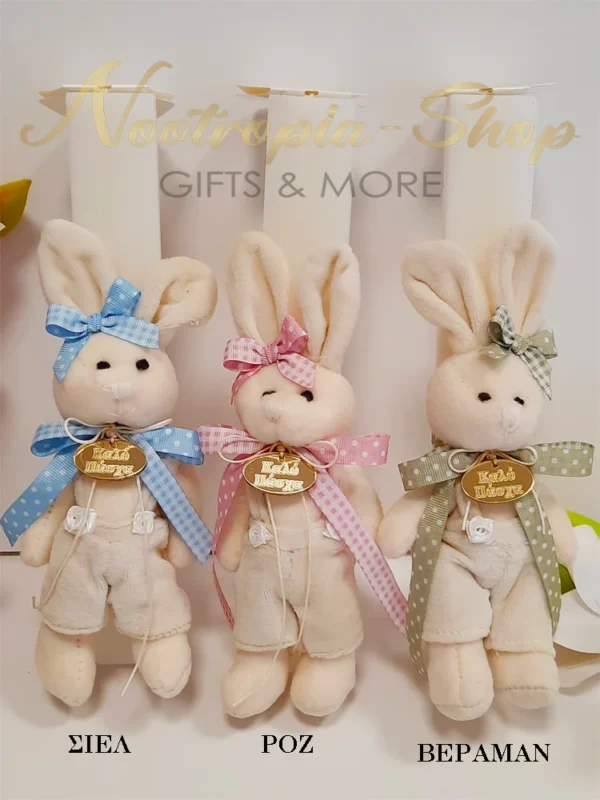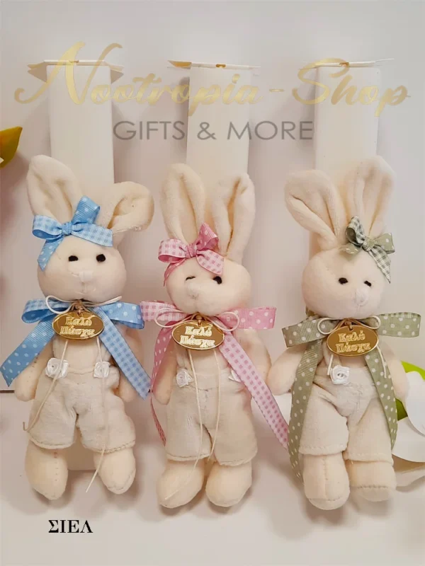 Είναι διακοσμημένη με λούτρινο λαγουδάκι σε τρείς αποχρώσεις Ροζ, Σιέλ, Βεραμάν στολισμένο με κορδέλες καρό & πουά. Στο λαιμό του έχει επιγραφή πλεξιγκλάς ΚΑΛΟ ΠΑΣΧΑ.