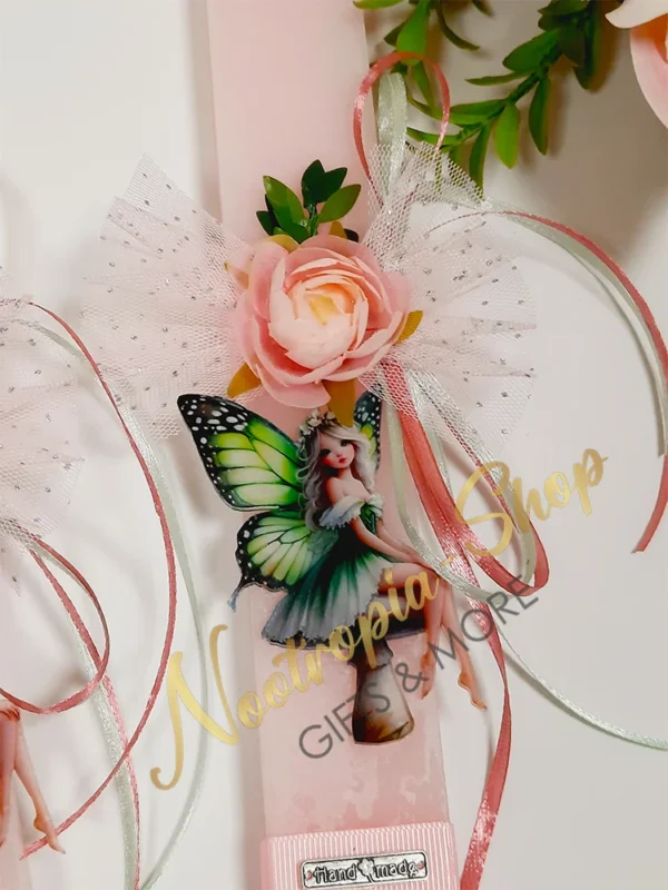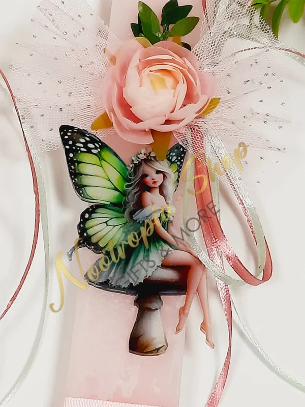 Χειροποίητη ρουστίκ λαμπάδα με πλεξιγκλάς νεράϊδα καθιστή σε μανιτάρι.