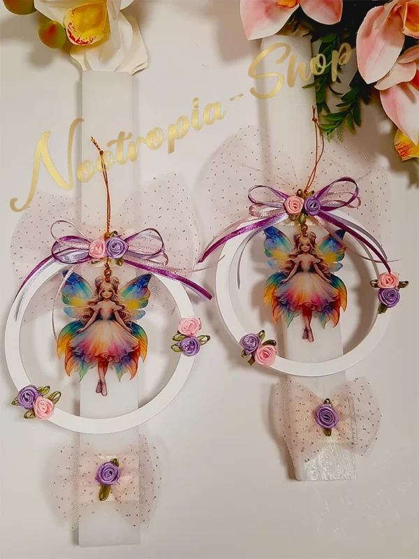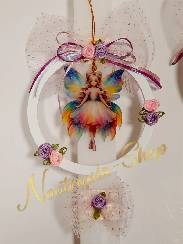 Χειροποίητη ρουστίκ λαμπάδα με πλεξιγκλάς Νεράιδα ουράνιο τόξο μέσα σε ξύλινο στεφάνι12 εκ. Στολισμένη με σατέν τριανταφυλλάκια, τούλι με γκλίτερ & σατέν κορδέλες.
